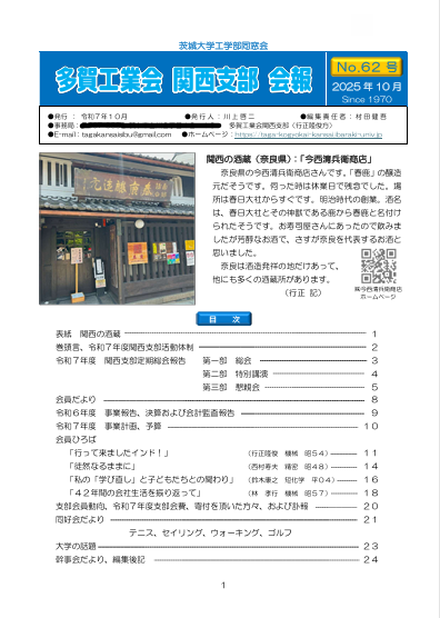 支部会報 2019.11.132025.12.31 多賀工業会関西支部会報 第62号(2025年10月) 会報第62号 お詫びと訂正(年会費、寄付頂いたのに未掲載だった方) 多賀工業会関西支部会報 第61号(2024年9月) 多賀工業会関西支部会報 第60号記念号(2023年10月) 多賀工業会関西支部会報 第59号(2022年11月) 多賀工業会関西支部会報 第58号(2021年6月) 多賀工業会関西支部会報 第57号(2019年5月) 正誤表:令和元年度の活動体制を次の表に差し替えてください。(正)支部活動体制の訂正 多賀工業会関西支部会報 創刊号(1990年8月号)