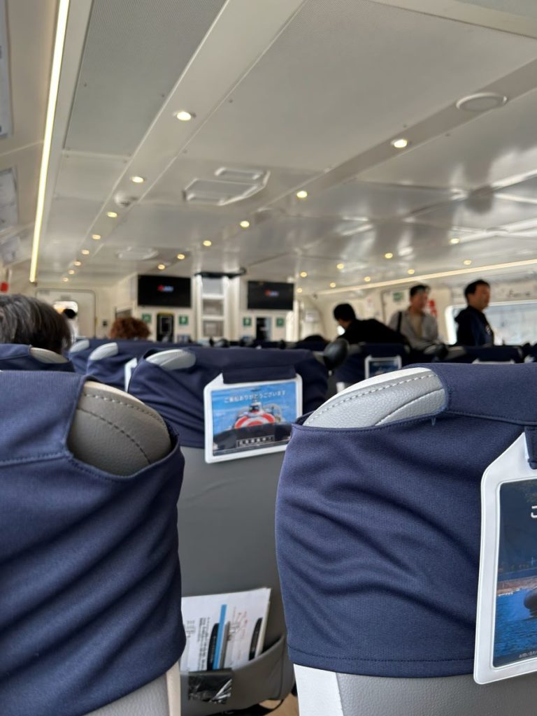 ホバークラフトは前方から乗船します。私はエンジン音やスカートの動きを見たくて後方の窓側へ。昼の便で9割ほど埋まっていました。